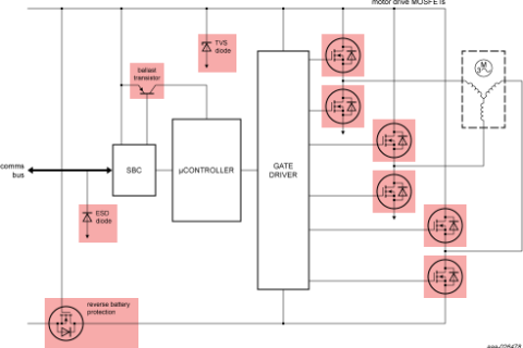 - 每個電機六個MOSFET可實現(xiàn)高效的電機驅(qū)動
